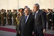 Jalal Talabani with U.S. President George W. Bush, reviewing an honor guard on Bush's visit to Iraq (December 14, 2008)