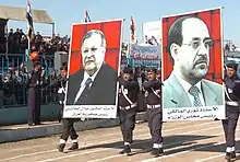 Iraqi police officers carry posters of Iraq's President Jalal Talabani and Prime Minister Nouri al-Maliki before a crowd of hundreds during the Provincial Iraqi Control ceremony in Najaf, Iraq (December 20, 2006)