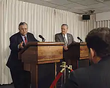 Iraqi President Jalal Talabani (left) responds to a reporter's question during a joint press conference with U.S. Secretary of Defense Donald H. Rumsfeld following their meeting in the Pentagon on Sept. 9, 2005.