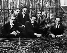 Ehrenfest's students, Leiden 1924. Left to right: Gerhard Heinrich Dieke, Samuel Abraham Goudsmit, Jan Tinbergen, Paul Ehrenfest, Ralph Kronig, and Enrico Fermi.