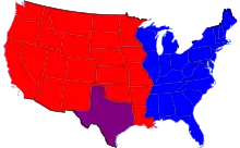 Map of nations in Jericho, the Allied States of America in red, the United States of America's remnants in blue, and Texas in purple.