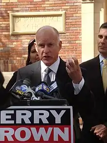 Edmund Gerald "Jerry" Brown Jr. (born April 7, 1938) is an American politician and lawyer who has been serving as the 39th Governor of California since 2011. A member of the Democratic Party, Brown previously served as the 34th Governor from 1975 to 1983, and is the longest-serving governor in California history. Prior to and following his first governorship, Brown served in numerous state, local and party positions, including three times a candidate for the Democratic nomination for President of the United States.
