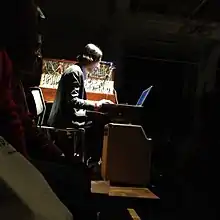 photo of Nobukazu Takemura, at the Serge Modular Synthesizer, at the John Cage 100th Anniversary event, Kyoto Art Center