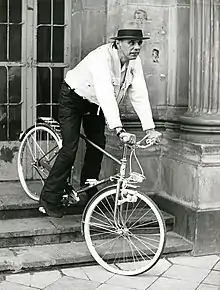 Joseph Beuys, undated: on his bike at the stairs of - very likely - the Art Academy Düsseldorf, where Beuys was kicked out in 1972; photo by Hans Lachmann