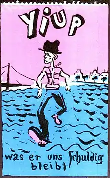 de:Peter Angermann, 1970: 'Yiup' (Beuys, crossing river Rhein) with signature: Was er uns Schuldig bleibt / What he still owes us