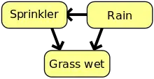 A simple Bayesian network. Rain influences whether the sprinkler is activated, and both rain and the sprinkler influence whether the grass is wet.