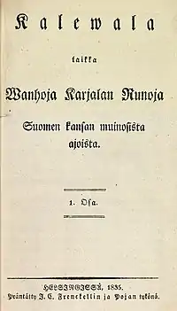 Inside front title page of The "Old" Kalevala, Finnish national epos, collection of old Finnish poems, by Elias Lönnrot. First edition; volume 1, 1835