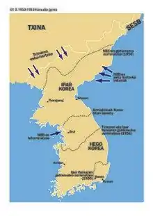 The Korean War (in South Korean Hangul: 한국전쟁, Hanja: 韓國戰爭, Hanguk Jeonjaeng, "Korean War"; in North Korean Chosungul: 조국해방전쟁, Joguk Haebang Jeonjaeng, "Fatherland Liberation War"; 25 June 1950 – 27 July 1953) was a war between North and South Korea, in which a United Nations force led by the United States of America fought for the South, and China fought for the North, which was also assisted by the Soviet Union. The war arose from the division of Korea at the end of World War II and from the global tensions of the Cold War that developed immediately afterwards.