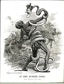 A 1906 Punch cartoon by Edward Linley Sambourne depicting Leopold II as a rubber snake entangling a Congolese rubber collector.