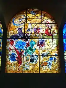 Chagall, 1961-62: 'Tribe of Joseph above the Torah ark', stained glass windows; location: Hadassah Medical Center, Israel