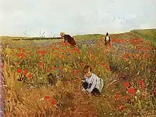 Mary Cassatt, 1875: 'Picking flowers in a field', oil-painting on panel; current location: National Gallery of Art, Washington D.C.