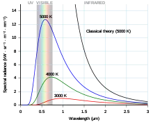 - Inasmuch as both Rayleigh's and Wien's laws of radiation, though incorrect, appear to express facts correctly at opposite limits of temperature and frequency, we may presume that the correct law must have an intermediary form, passing over into Rayleigh's when [temperature] T is large and [frequency] ν small, and into Wein's when the reverse situation... Planck, guided by these considerations, devised a new theory of radiation which he called the "Quantum Theory." From this theory Planck was able to derive a radiation law which satisfied Wien's relation, ...the displacement law [when the temperature is increased, intensities of all the frequencies increase, while the radiation of maximum intensity is directly proportional to the absolute temperature] and Stefan's law, and which was in excellent agreement with experimental measurements at all temperatures.