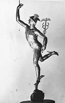 Atlas' grandson obeys his sire's words and hastily thereupon binds the winged sandals on to his ankles and with his wide hat covers his locks and tempers the stars. Then he thrusts the wand in his right hand; with this he was wont to banish sweet slumber or recall it, with this to enter black Tartarus and give life to bloodless phantoms. Down he leapt and shivered as the thin air received him. No pause; he takes swift and lofty flight through the void and traces a vast arc across the clouds. - Statius