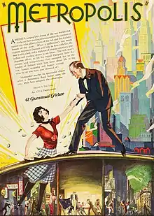 Metropolis is a 1927 German expressionist film set in a futuristic city sharply divided between the working class and the city planners, in which the son of the city's mastermind falls in love with a working class prophet who predicts the coming of a savior to mediate their differences. It is regarded as a pioneering work of the science-fiction genre in movies, being among the first feature-length movies of the genre.