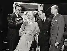 Rouben Mamoulian, Miriam Hopkins, visitor Michael Balcon, and Kenneth Macgowan on the set of Becky Sharp (film) (1935)
