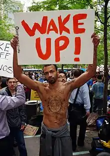 Occupy Wall Street was an ongoing series of demonstrations in New York City based in Zuccotti Park (formerly "Liberty Plaza Park"), originally called for by the Canadian activist group Adbusters. The action has been compared to the Arab Spring movement (particularly the Tahrir Square protests in Cairo, which initiated the 2011 Egyptian revolution) and the Spanish Movimiento 15M. The participants of the event, who have called themselves the "99 percenters", are mainly protesting against social and economic inequality, corporate greed, and the influence of corporate money and lobbyists on government, among other concerns. By October 9, similar demonstrations had been held or were ongoing in 70 major cities and more than 600 communities.