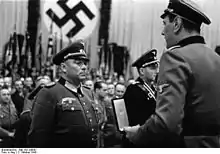 Otto Skorzeny (June 12, 1908 – July 7, 1975) was an Austrian SS-Standartenführer (colonel) in the German Waffen-SS during World War II. After fighting on the Eastern Front, he was chosen as the field commander to carry out the rescue mission that freed the deposed Italian dictator Benito Mussolini from captivity. Skorzeny was also the leader of Operation Greif, in which German soldiers were to infiltrate through enemy lines, using their opponents' language, uniforms, and customs. At the end of the war, Skorzeny was involved with the Werwolf guerrilla movement and the ODESSA network where he would serve as Spanish coordinator.