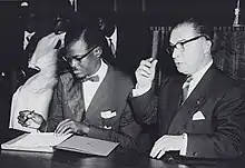 Patrice Lumumba signs the document granting independence to the Congo next to Belgian Prime Minister Gaston Eyskens