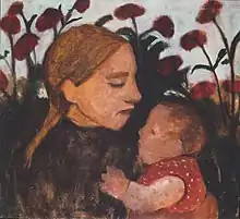 Paula Modersohn-Becker, 1902: 'Girl with child in front of red flowers / Mädchen mit Kind vor roten Blumen', oil on canvas; current location: Gemeentemuseum Den Haag The Hague