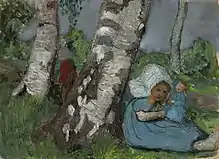 Paula Modersohn-Becker, c. 1902: 'Child with doll sitting on birch trunk', oil on cardboard; location unknown