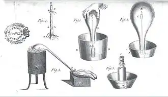 - There are many bodies, in the calcination of which an evaporation of volatile parts happens, and also a destruction or deprivation of their inflammable principle, although without any sensible combustion of this latter. Such particularly are all combinations of imperfect metallic matters with vitriolic and nitrous acids: when these bodies are exposed to fire, their acid evaporates, and at the same time carries off with it their inflammable principle. We have examples of this kind of calcination in exposing to fire Martial Vitriol and Bezoar Mineral.