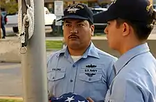 - [T]he pledge of allegiance to the flag, 'I pledge allegiance to the flag of the United States of America and to the Republic for which it stands, one Nation indivisible, with liberty and justice for all', is rendered by standing with the right hand over the heart. However, civilians will always show full respect to the flag when the pledge is given by merely standing at attention, men removing the headdress.