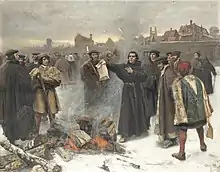 Moreover, because the preceding errors and many others are contained in the books or writings of Martin Luther, we likewise condemn, reprobate, and reject completely the books and all the writings and sermons of the said Martin, whether in Latin or any other language, containing the said errors or any one of them; and we wish them to be regarded as utterly condemned, reprobated, and rejected. We forbid each and every one of the faithful of either sex, in virtue of holy obedience and under the above penalties to be incurred automatically, to read, assert, preach, praise, print, publish, or defend them. They will incur these penalties if they presume to uphold them in any way, personally or through another or others, directly or indirectly, tacitly or explicitly, publicly or occultly, either in their own homes or in other public or private places.