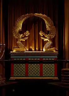 - Jones: Uh, there's a... picture of it right here. [He opens an old leatherback Bible to an illustration showing the Israelites holding the Ark above them, with great beams of light emanating from the Ark, piercing the ranks of the opposing army surrounding them, with the soldiers in various states of agony and death.] That's it.