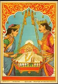 • They arranged even a dramatic entertainment, to enhance the religious feeling in this great festival. Valmiki, the great sage-poet, came with his pupils, Lava and Kusha, the unknown sons of Rama....Under the direction of Valmiki, the life of Rama was sung by Lava and Kusha, who fascinated the whole assembly by their charming voice and appearance. Poor Rama was nearly maddened, and when in the drama, the scene of Sita's exile came about, he did not know what to do. Then the sage said to him, "Do not be grieved, for I will show you Sita." Then Sita was brought upon the stage and Rama delighted to see his wife.