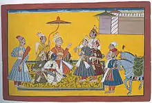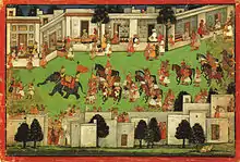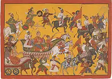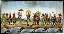 Early during the period of exile, Bharata, the younger brother had come and informed Rama, of the death of the old king [Dasharatha] and vehemently insisted on his occupying the throne. During Rama's exile Bharata would on no account ascend the throne and out of respect placed a pair of Rama's wooden shoes on it as a substitute for his brother. Then Rama returned to his capital, and by the common consent of his people he became the king of Ayodhya.