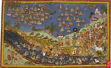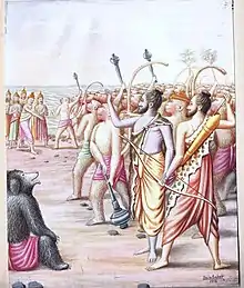• After reaching the enemy's territory, Rama and his supporters were making consultations with each other as regards the course of action to be taken. Vibhishan showed the topography of Lanka to Rama from the peak of Mount Subet.