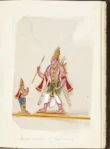 • In sculpture, Rama is represented as a standing figure, holding an arrow in his right hand and a bow in his left. His image in a shrine or temple is almost invariably attended by figures of his wife, Sita, his favourite half-brother, Lakshmana, and his monkey devotee, Hanuman. In painting, he is depicted dark in colour (indicating his affinity with Lord Vishnu), with princely adornments and the kirita-makuta (tall conical cap) on his head indicating his royal status. Rama’s exploits were depicted with great sympathy by the Rajasthani and Pahari schools of painting in the 17th and 18th centuries.