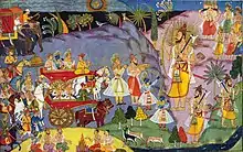 Rama and Lakshmana before Jatayu - Jatayu, a divine bird, the king of the vultures. He was Sampati. According to Ramayana and Mahabharata, he was the son of Aruna and Shyeni. In the Ramayana he tried to prevent Ravana from carrying away Sita, but was wounded and killed. Rama and Lakshmana performed his last rites, and he ascended to heaven in a chariot of fire.