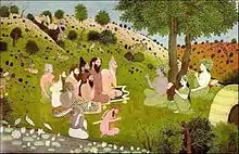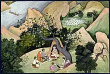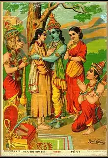 • Maharshi Bhardwaj was sitting with his disciples, after completing his yagna. Rama, Laxman and Sita greeted him and touched his feet. Rama said, "O great Muni! This is my younger brother Laxman. This is my wife Sita and I am Rama, Dasharath’s son. In obedience to our father’s command we have come to the forests.