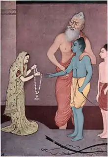 • Now, there was another king, called Janaka, and this king had a beautiful daughter named Sitâ. Sita was found in a field; she was a daughter of the Earth, and was born without parents....When she was of a marriageable age, the king wanted to find a suitable husband for her...There was an ancient Indian custom called Svayamvara, by which the princesses used to choose husbands....There were numbers of princes who aspired for the hand of Sita; the test demanded on this occasion was the breaking of a huge bow, called Haradhanu. All the princes put forth all their strength to accomplish this feat, but failed. Finally, Rama took the mighty bow in his hands and with easy grace broke it in twain. Thus Sita selected Rama, the son of King Dasharatha for her husband, and they were wedded with great rejoicings.
