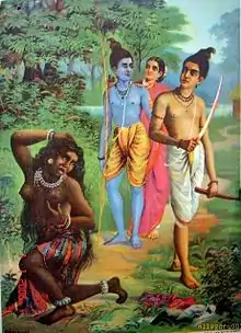 ...one day there came a demon giantess. She was the sister of the giant king of Lanka (Ceylon) [Ravana]. Roaming through the forest at will, she came across Rama, and seeing that he was a very handsome man, she fell in love with him at once....