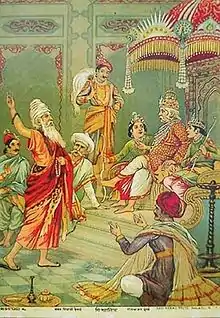 ...the giant king [Ravana], who had taken the form of a mendicant monk, stood at the gate and asked for alms. "Wait awhile," said Sita, "until my husband comes back and I will give you plentiful alms." ...