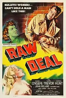 Raw Deal is a 1948 film noir about a man who has taken the rap for another who then double-crosses him with a flawed escape plan and other means intended to get rid of him.
