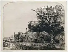 Rembrandt, c. 1650: 'Landscape with Three Gabled Cottages beside a Road', etching and drypoint on paper; location: Rijksmuseum Amsterdam Rijksprentenkabinet