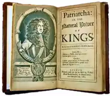 Sir Robert Filmer (c. 1588 – 26 May 1653) was an English political theorist who defended the divine right of kings. His best known work, Patriarcha, published posthumously in 1680, was the target of numerous Whig attempts at rebuttal, including Algernon Sidney's Discourses Concerning Government, James Tyrrell's Patriarcha Non Monarcha and John Locke's Two Treatises of Government. Filmer also wrote critiques of Thomas Hobbes, John Milton, Hugo Grotius and Aristotle.