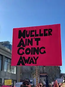 "Mueller Ain't Going Away" sign at the San Francisco, California Women's March in 2018