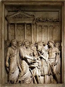 Marcus Aurelius and members of the Imperial family offer sacrifice in gratitude for success against Germanic tribes: contemporary bas-relief, Capitoline Museum, Rome