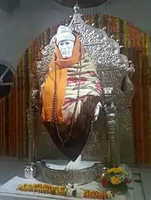 Image of Sai Baba in a temple in a winter attire.
