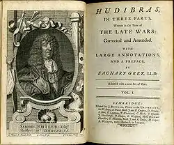 Frontispiece and titlepage of a 1744 illustrated and annotated edition of Butler's Hudibras