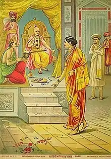 - In the story of Sāvitrī we have one of the finest of the many ideal female characters which the older epic poetry of India has created. Sāvitrī, daughter of Açvapati, king of Madra, chooses as her husband Satyavat, the handsome and noble son of a blind and exiled king, who dwells in a forest hermitage. Though warned by the sage Nārada that the prince is fated to live but a single year, she persists in her choice, and after the wedding departs with her husband to his father's forest retreat. Here she lives happily till she begins to be tortured with anxiety on the approach of the fatal day. When it arrives, she follows her husband on his way to cut wood in the forest. After a time he lies down exhausted. Yama, the god of death, appears, and taking his soul, departs. As Sāvitrī persistently follows him, Yama grants her various boons, always excepting the life of her husband; but yielding at last to her importunities, he restores the soul to the lifeless body. Satyavat recovers, and lives happily for many years with his faithful Sāvitrī.