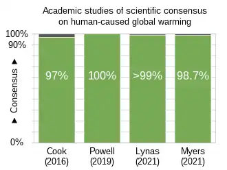 - ↑ (19 October 2021)"Greater than 99% consensus on human caused climate change in the peer-reviewed scientific literature". Environmental Research Letters 16 (11). DOI:10.1088/1748-9326/ac2966.