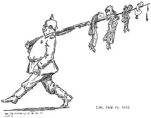 Cartoon on stories of German soldiers impaling children on their bayonets - of whole families'; incidents of women and children being used as human shields during combat; 'numerous' cases of rape; and horrific examples of children being bayoneted by drunken German troops. The 'evidence' on which the committee based its allegations was, in many cases, extremely flimsy. - Bryce report