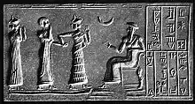 Original 1915 caption: "Worship of the Moon God. Cylinder-seal of Khashkhamer, patesi of Ishkun-Sin (in North Babylonia), and vassal of Ur-Engur, king of Ur (c. 2400 BCE) (British Museum). Photo: Mansell".
