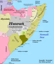 Somalia (Somali: Jamhuuriyadda Federaalka Soomaaliya, Arabic: جمهورية الصومال الفدرالية), officially the Federal Republic of Somalia, is a country located in the Horn of Africa. It is shaped like the number seven. It is bordered by Ethiopia to the west, Djibouti to the northwest, the Gulf of Aden to the north, the Indian Ocean to the east, and Kenya to the southwest.