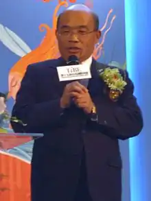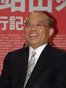 Su Tseng-chang (蘇貞昌; Sū Zhēnchāng; born 28 July 1947) is a politician in Taiwan (Republic of China). He is currently the Premier since 14 January 2019.